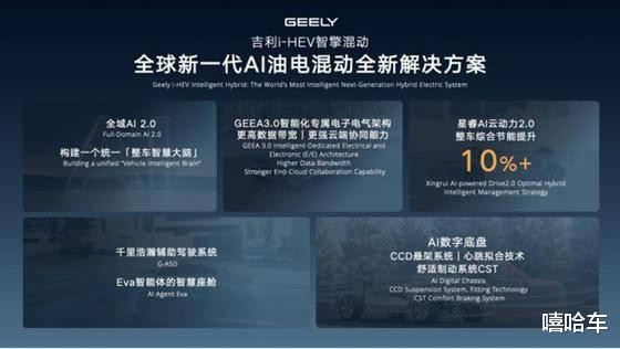 作为全球首个完成全域AI布局的车企,吉利通过全域AI 2.0对智驾域、座舱域、底盘域、动力域等各个域的感知、数据、信息的全面共享,构建了一个统一的“整车智慧大脑”。为了满足用户对油电混动“像电车一样聪明”的需求,吉利i-HEV智擎混动技术在全域AI 2.0赋能下,全面搭载GEEA 3.0智能化专属电子电气架构,具备了更高的数据带宽与强大的端云协同能力,颠覆传统混动的智能体验。